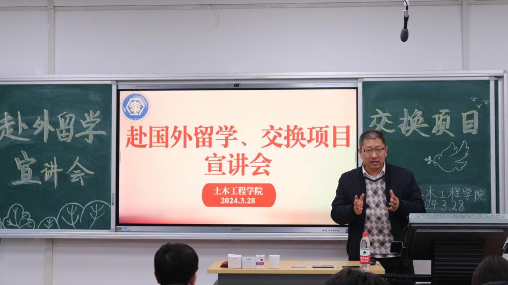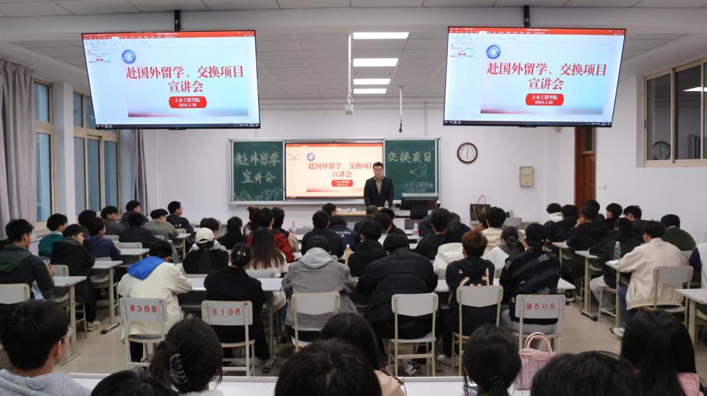 3月28日,8xbet手机客户端土木工程学院于博学楼A302召开出国交流政策宣讲会。学院领导班子、国际教育学院(国际交流合作处)负责同志以及近百名学生参加宣讲会。