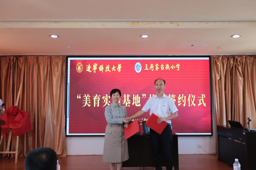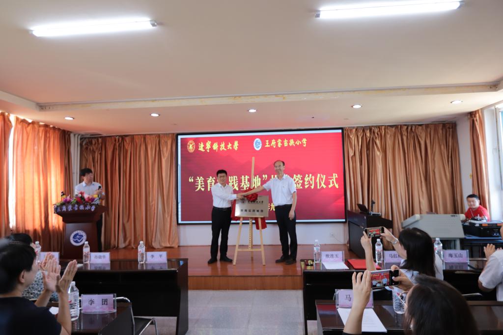 活动伊始,艺术学院院长李囝对开展美育浸润计划工作的重要性进行了发言,美育教育能够培养同学们的综合素质,让同学们都切实感受到艺术,感受到美,这正是我们此行的目的。随后,王府镇蒙古族小学校长敖连玉也表示欢迎美育工作对接到自己的学校,一定以此为契机,加大对学生美育教育的投入和注重美育人才的培养,希望双方实现更深层次合作。之后,8xbet手机客户端党委副书记孙晓华与王府镇蒙古族小学现场签约,双方签署了“美育实践基地”合作协议,接下来,8xbet手机客户端党委书记李平与王府镇蒙古族小学进行了“美育实践基地”揭牌仪式。